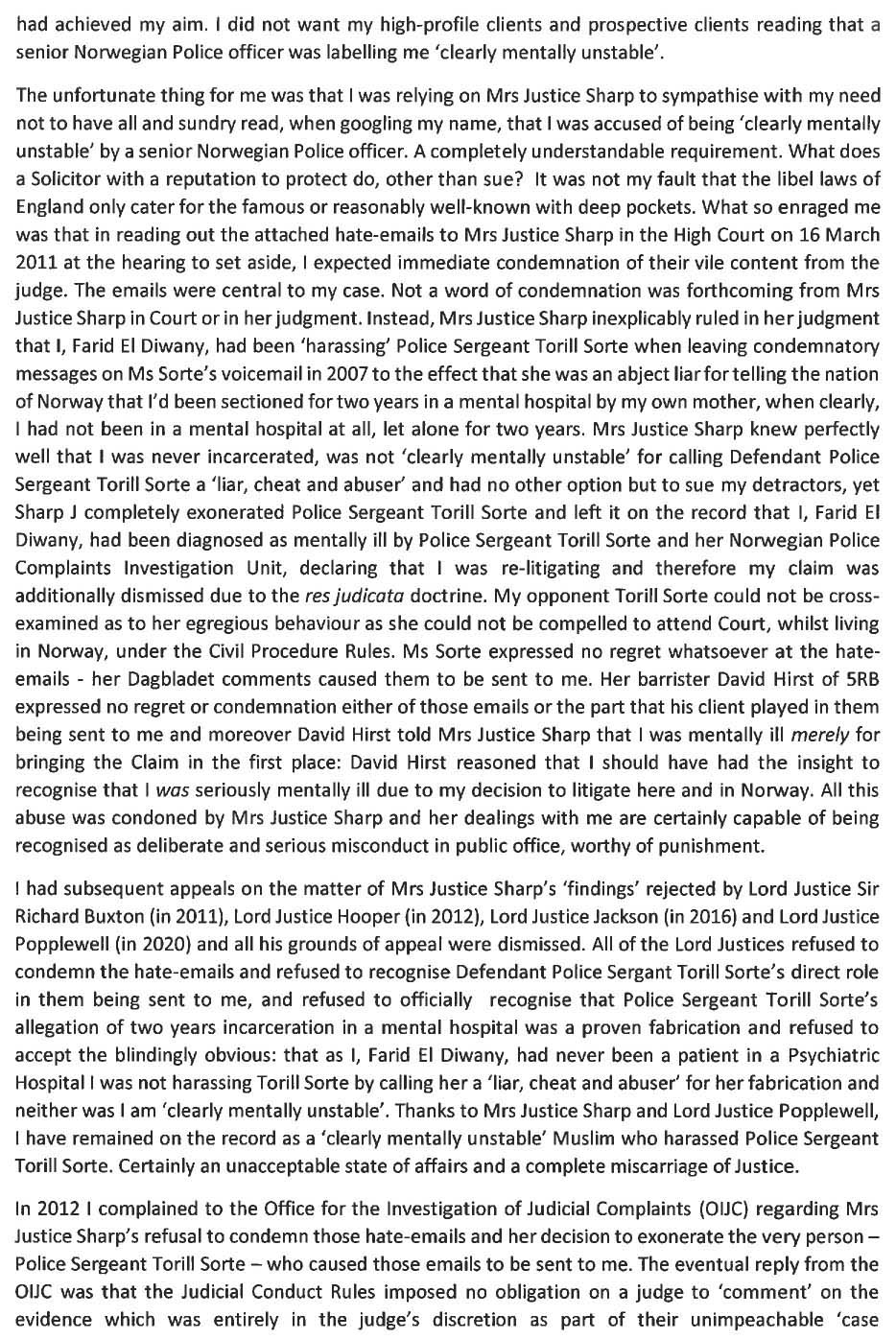 In 2021 Mr Justice Saini at the High Court declared in paragraph 65 of his judgment that Heidi Schøne was a liar when he ruled that her Norwegian Press stories were "far from the truth" and that she sold her stories for "financial reward". Saini J, unreservedly, condemned the Norwegian Press for their Islamophobic abuse of me and he condemned the hate-emails. Mrs Justice Sharp was exposed as a bigot.