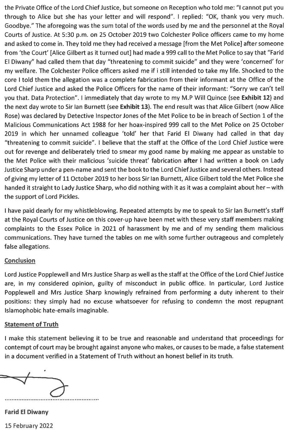 Inspector Jeff Cook of the Met Police you will see from his attached 2022 email to me believes Lady Justice Sharp and Lord Justice Popplewell have a case to answer before the Crown Prosecution Service for misconduct in public office for Islamophobia, following receipt of my attached Witness Statement.